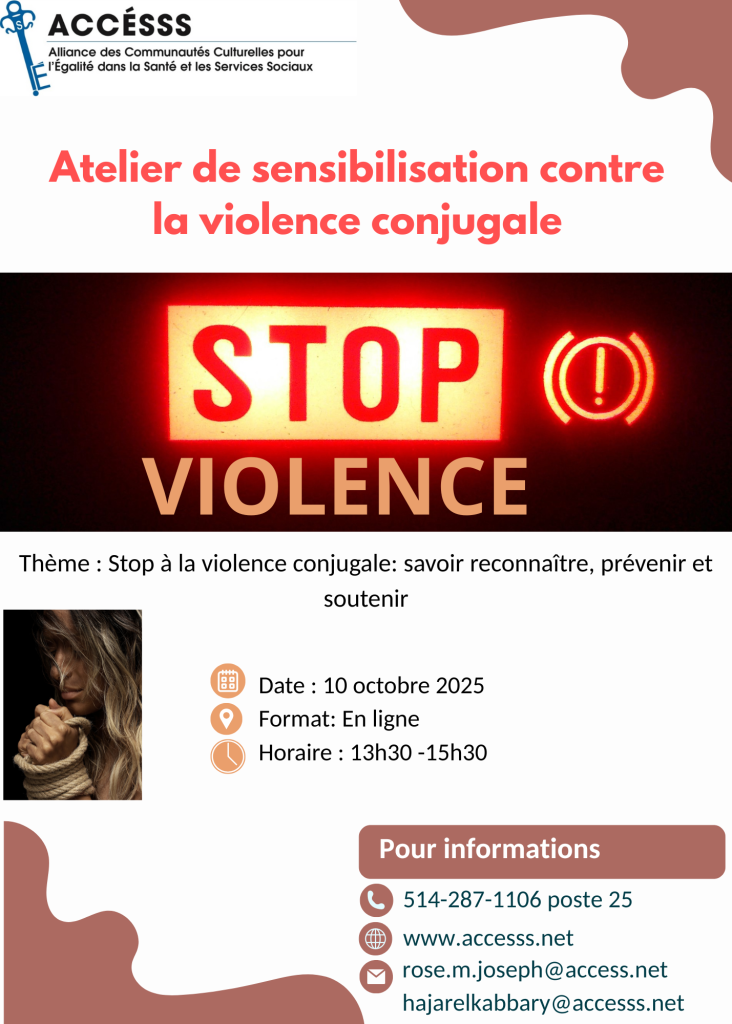 Pour des communautés saines et épanouies, brisons le silence autour de la violence conjugale. Bonjour à toutes et à tous, ACCÉSSS a le plaisir de vous inviter à un atelier de sensibilisation sur la violence conjugale, qui se déroulera autour du thème : « Stop à la violence conjugale : savoir reconnaître, prévenir et soutenir ». […]